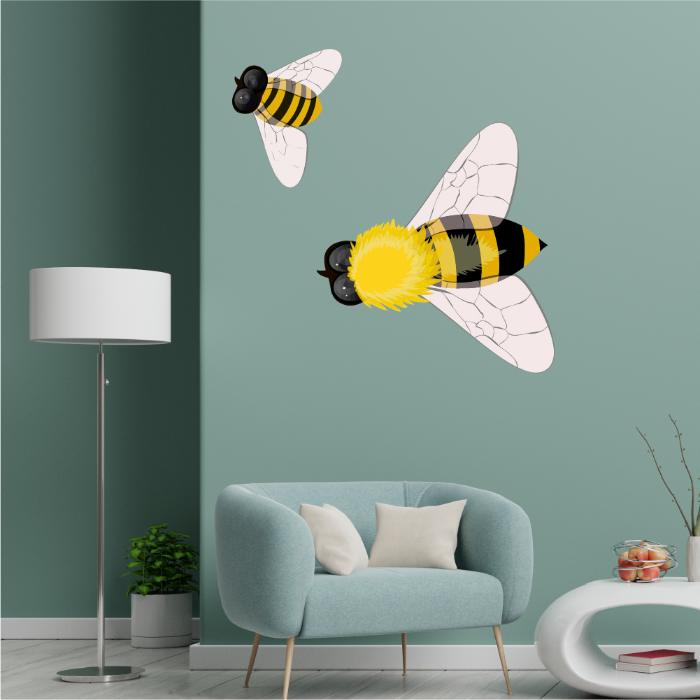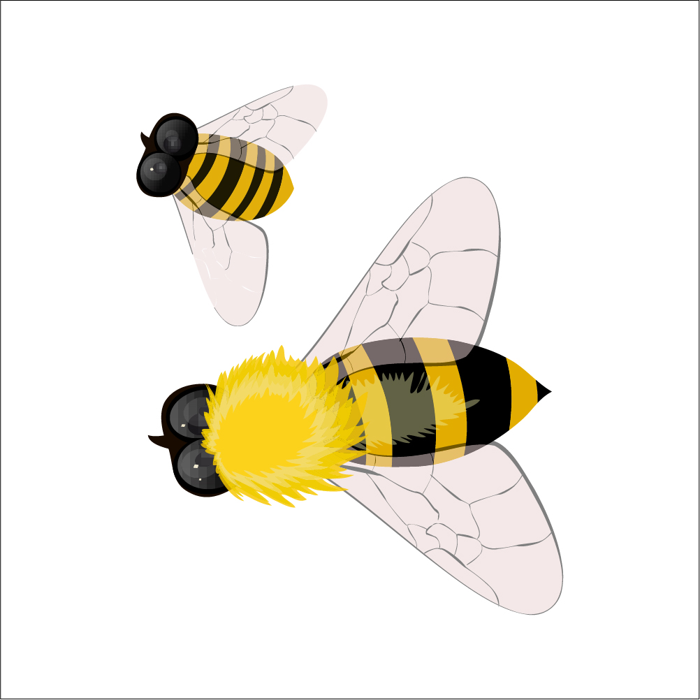 Abeilles illustrées en plein vol, avec un corps rayé jaune et noir. Les ailes semi-transparentes sont légèrement décalées, donnant une impression de mouvement.