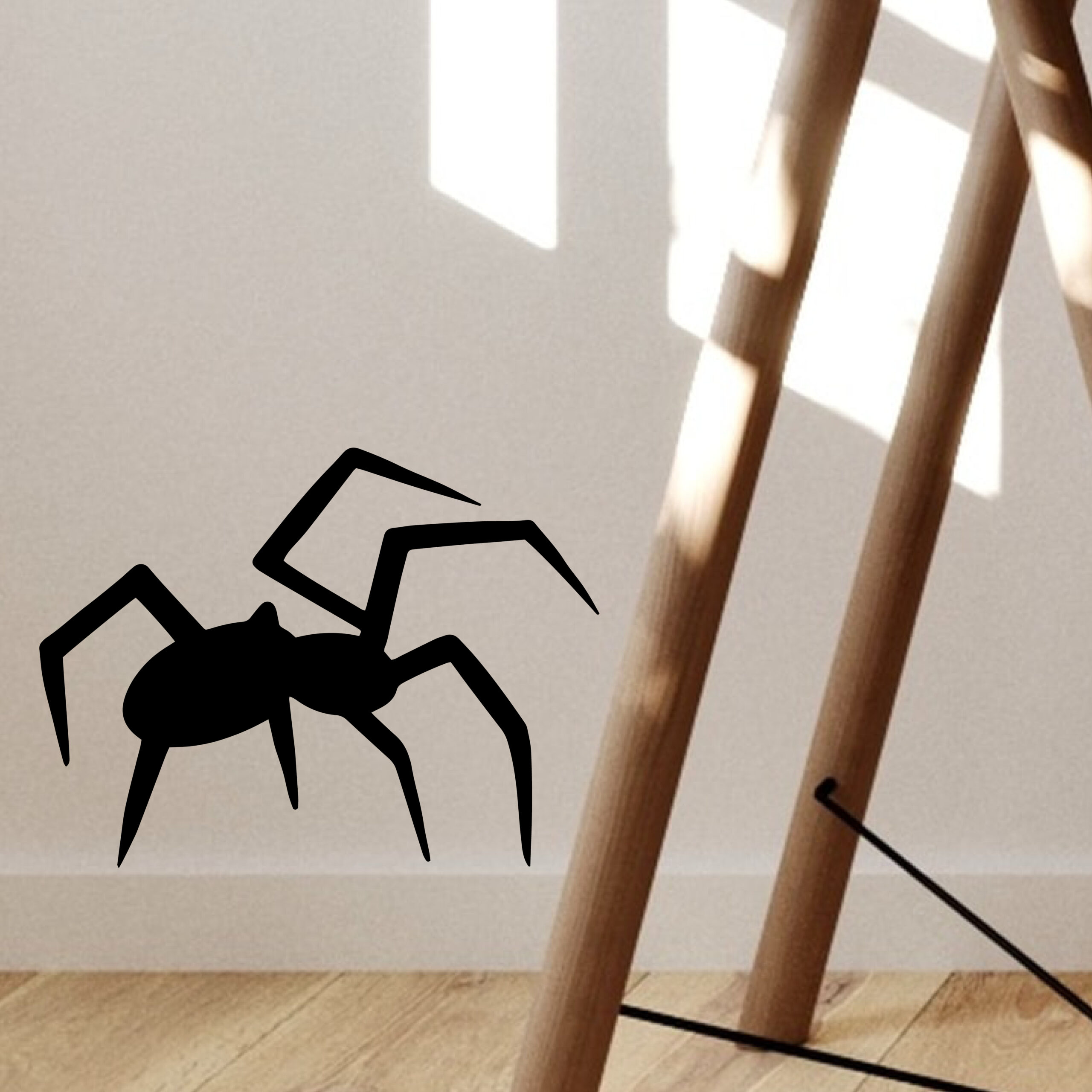 L’araignée est dessinée avec un corps et des pattes articulées très marquées. L’orientation donne une impression de mouvement et met en valeur la longueur des membres.