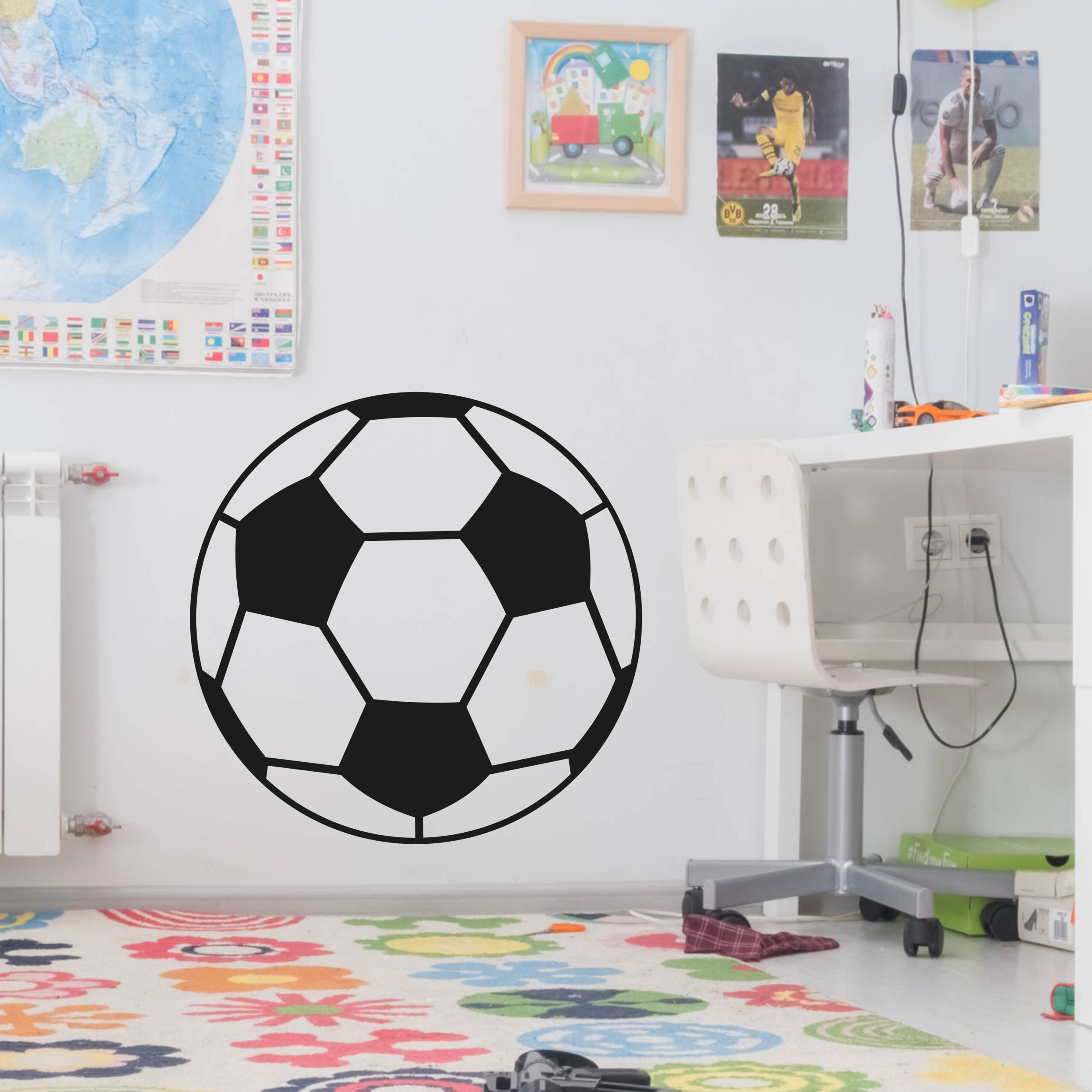 Graphisme épuré d’un ballon de football noir et blanc, avec des facettes bien contrastées. Idéal pour personnaliser un ordinateur, une gourde ou un carnet avec une touche sport intemporelle.