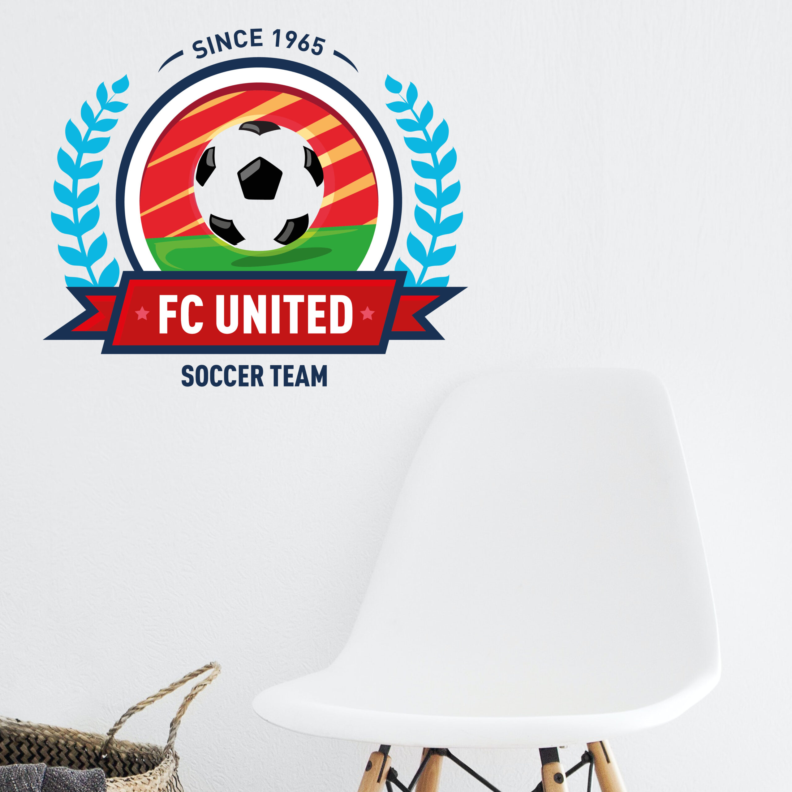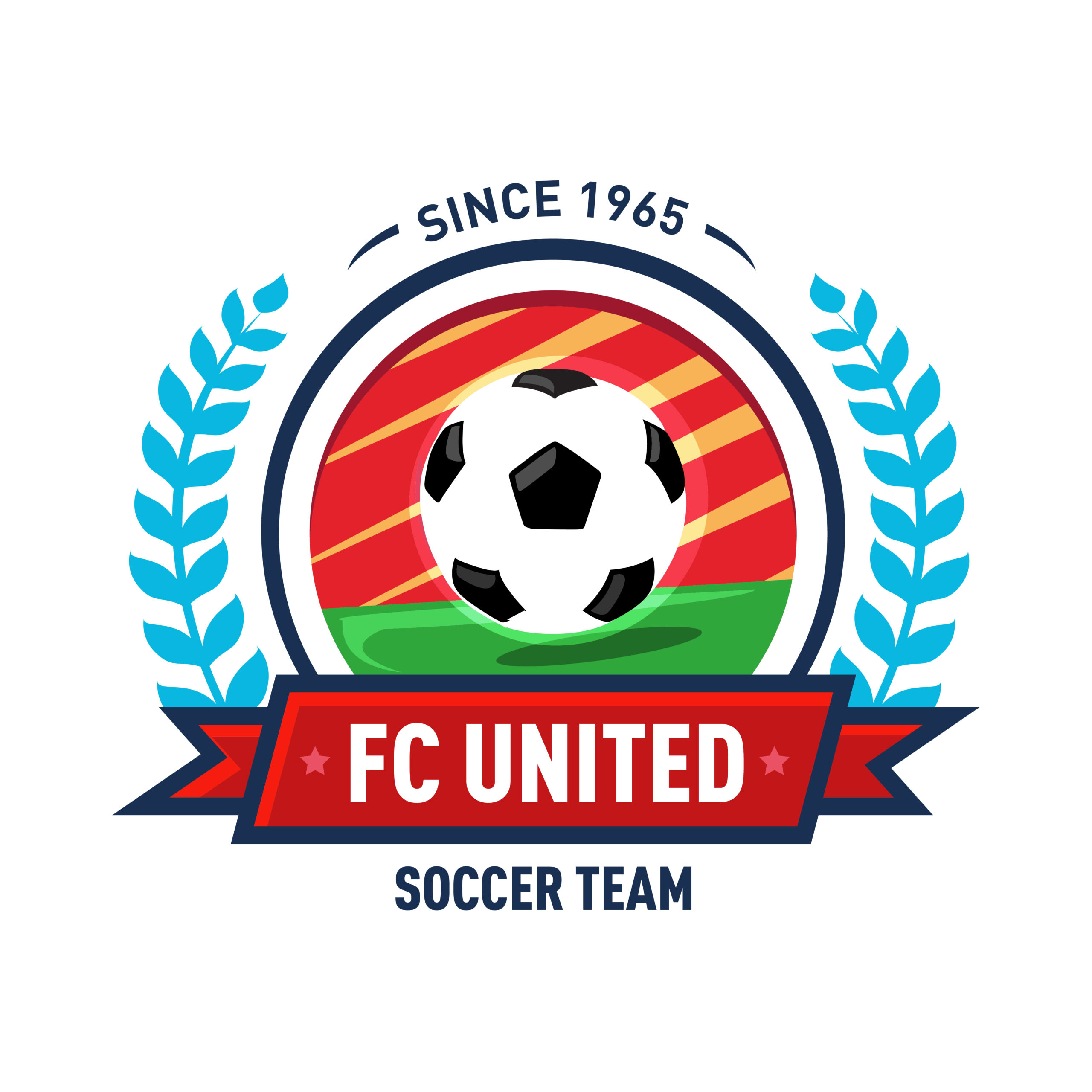 Blason de club de soccer avec ruban et couronne de laurier, couleurs vives et ballon central. Un visuel “team spirit” pour supporter l’ambiance match.