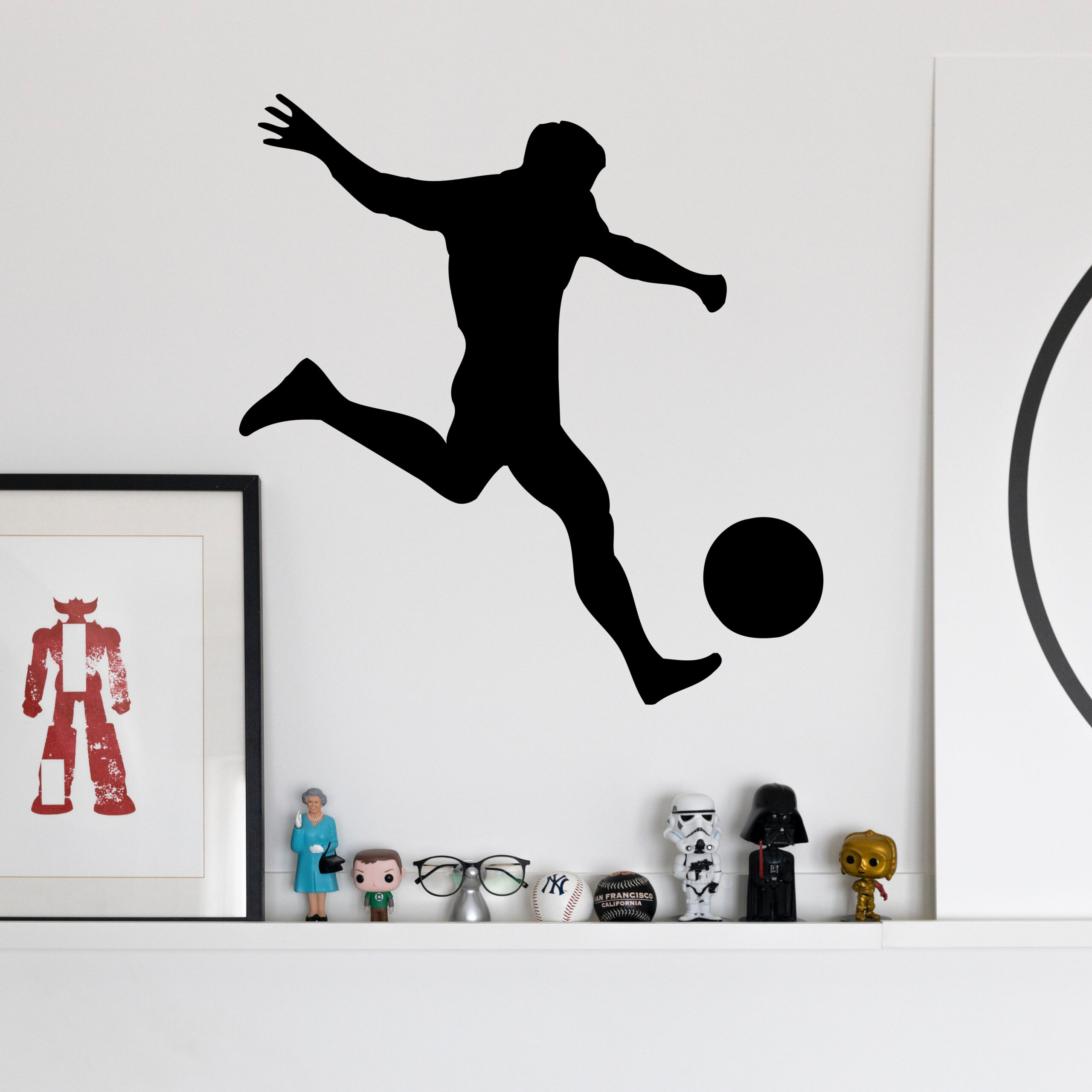 Footballeur en action de tir, jambe lancée vers l’avant et ballon placé devant. Un visuel simple et efficace pour afficher une passion de jeu.