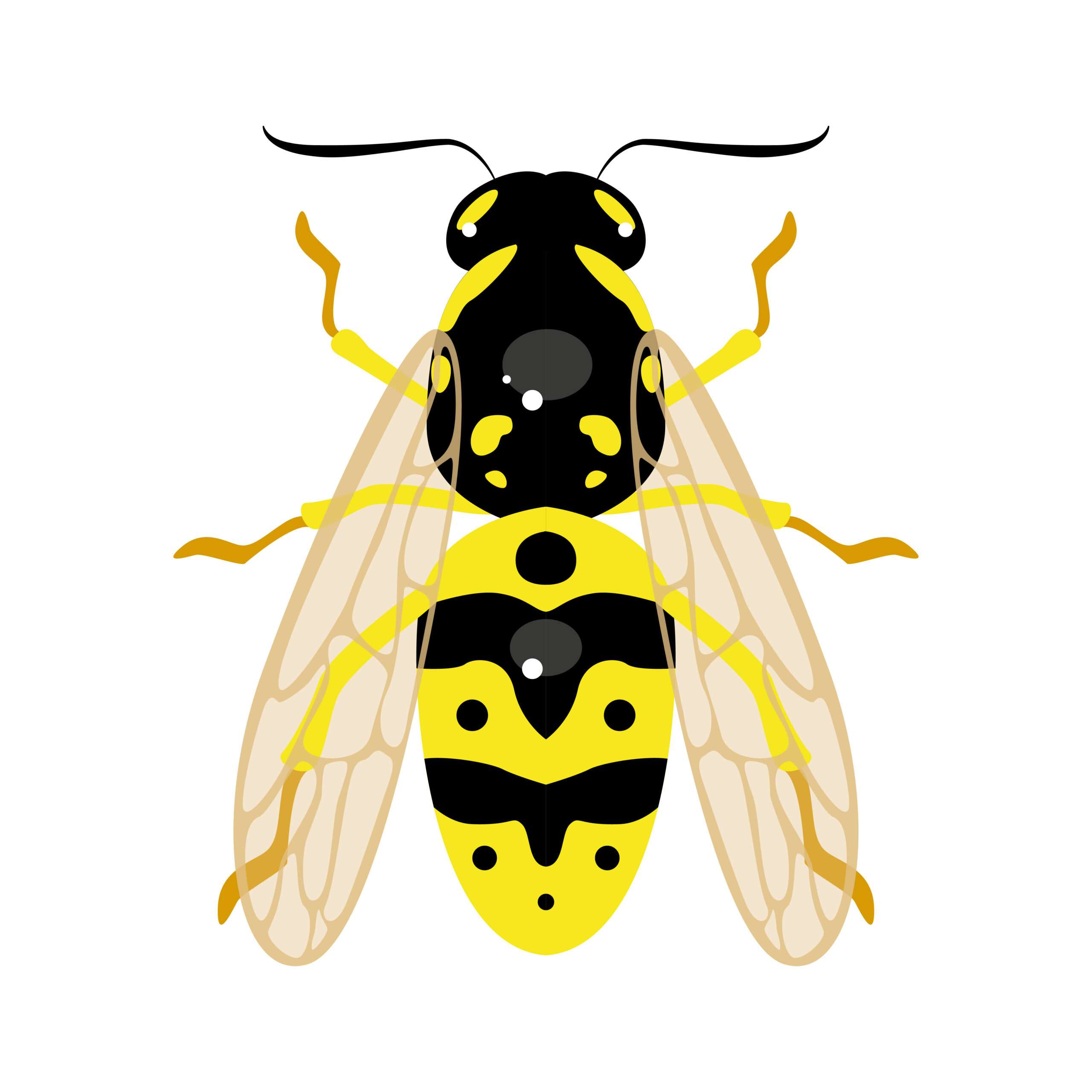 La guêpe est représentée vue de dessus avec un abdomen rayé jaune et noir. Les ailes translucides sont déployées de part et d’autre du corps, laissant apparaître les nervures, tandis que les pattes et les antennes sont clairement visibles.