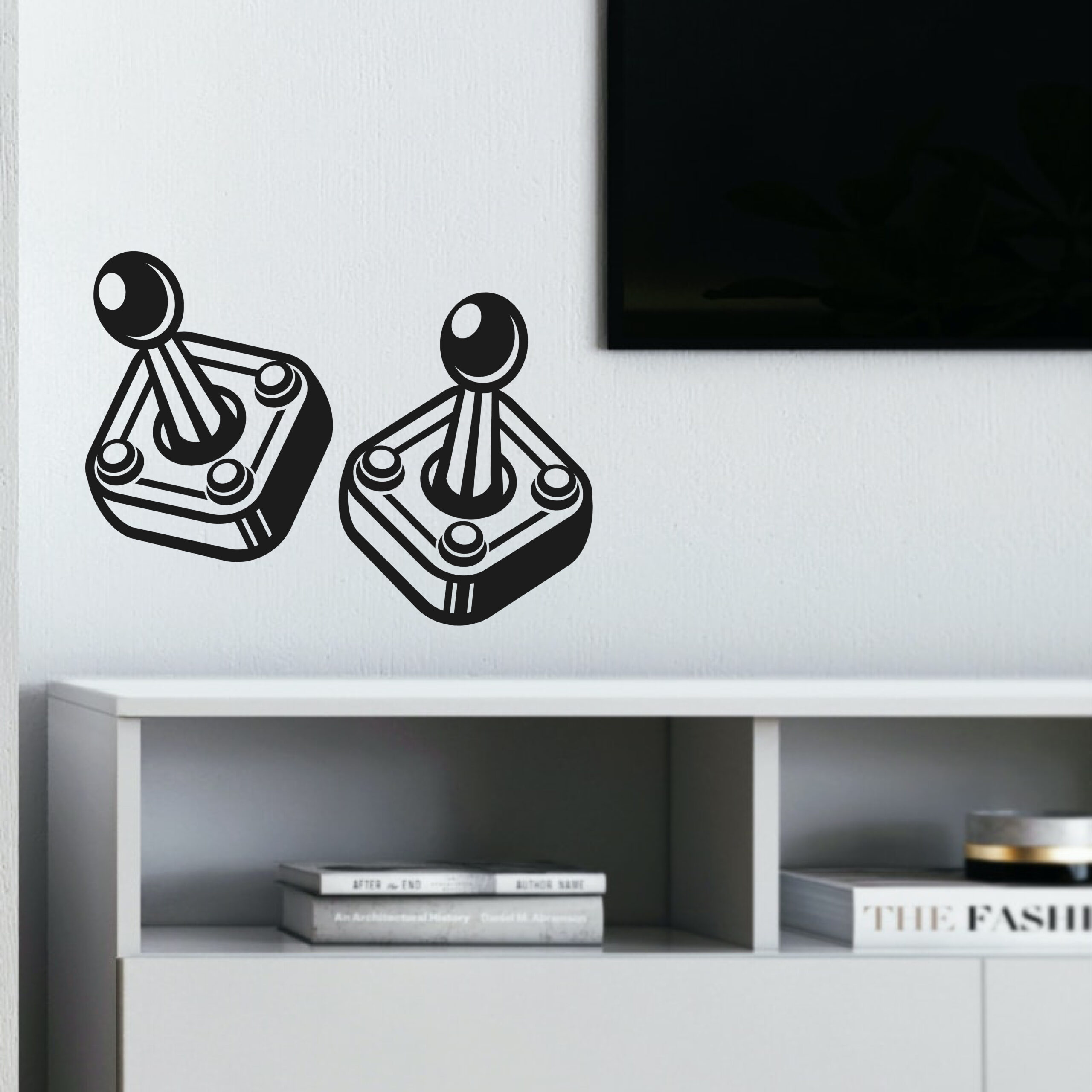 Le sujet mis en avant est des joysticks d’arcade rétro, facilement reconnaissable par ses codes visuels. La composition privilégie la lisibilité et une approche graphique épurée.