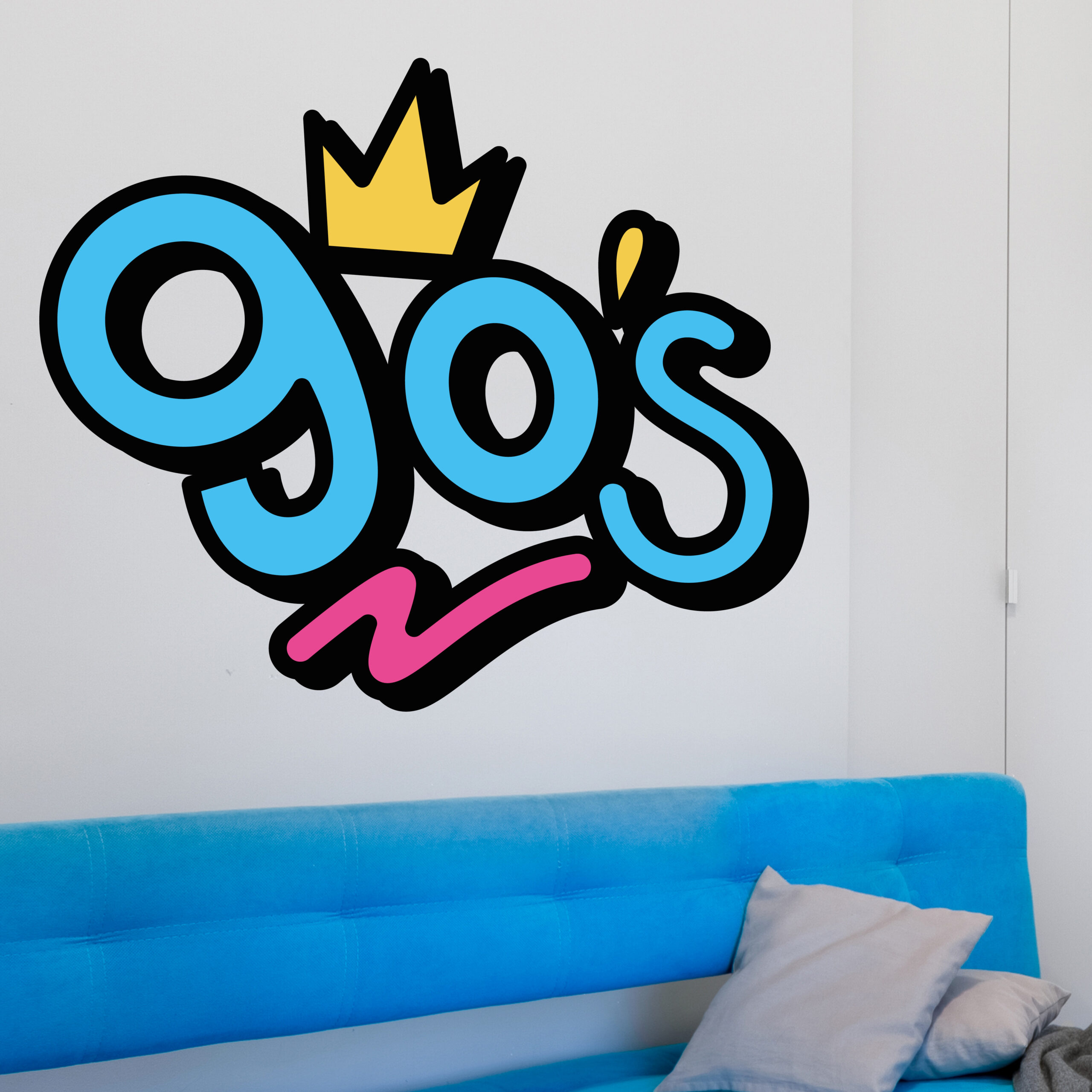 Illustration d’un logo graphique coloré inspiré des années 90, avec des formes arrondies et une typographie dynamique. Ce visuel évoque l’esthétique pop et ludique de cette époque, idéale pour apporter une touche rétro et énergique à un support décoratif.