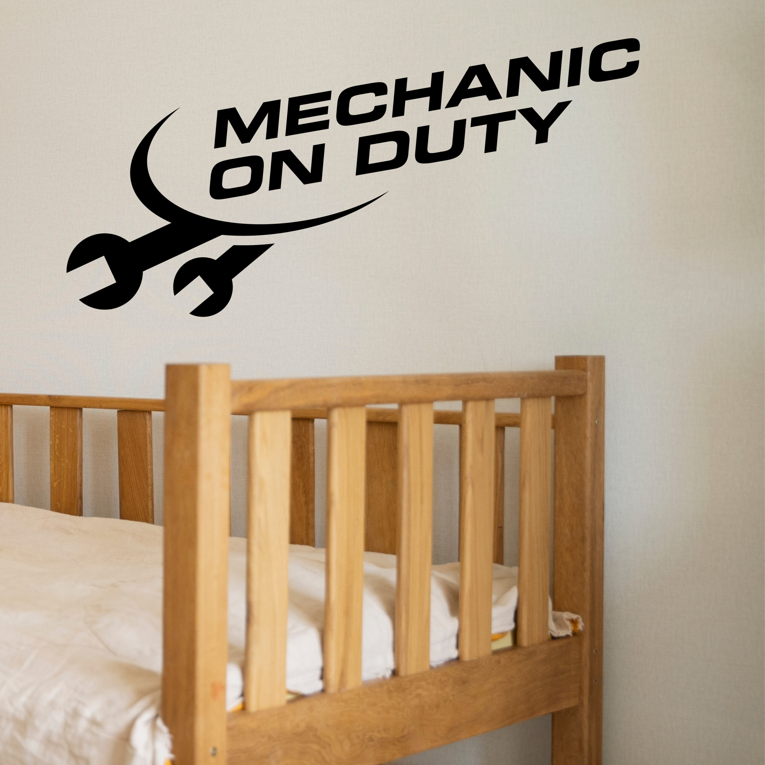 Lettrage Mechanic on Duty accompagné d’une clé, évoquant le travail du mécanicien et l’univers de la réparation automobile.