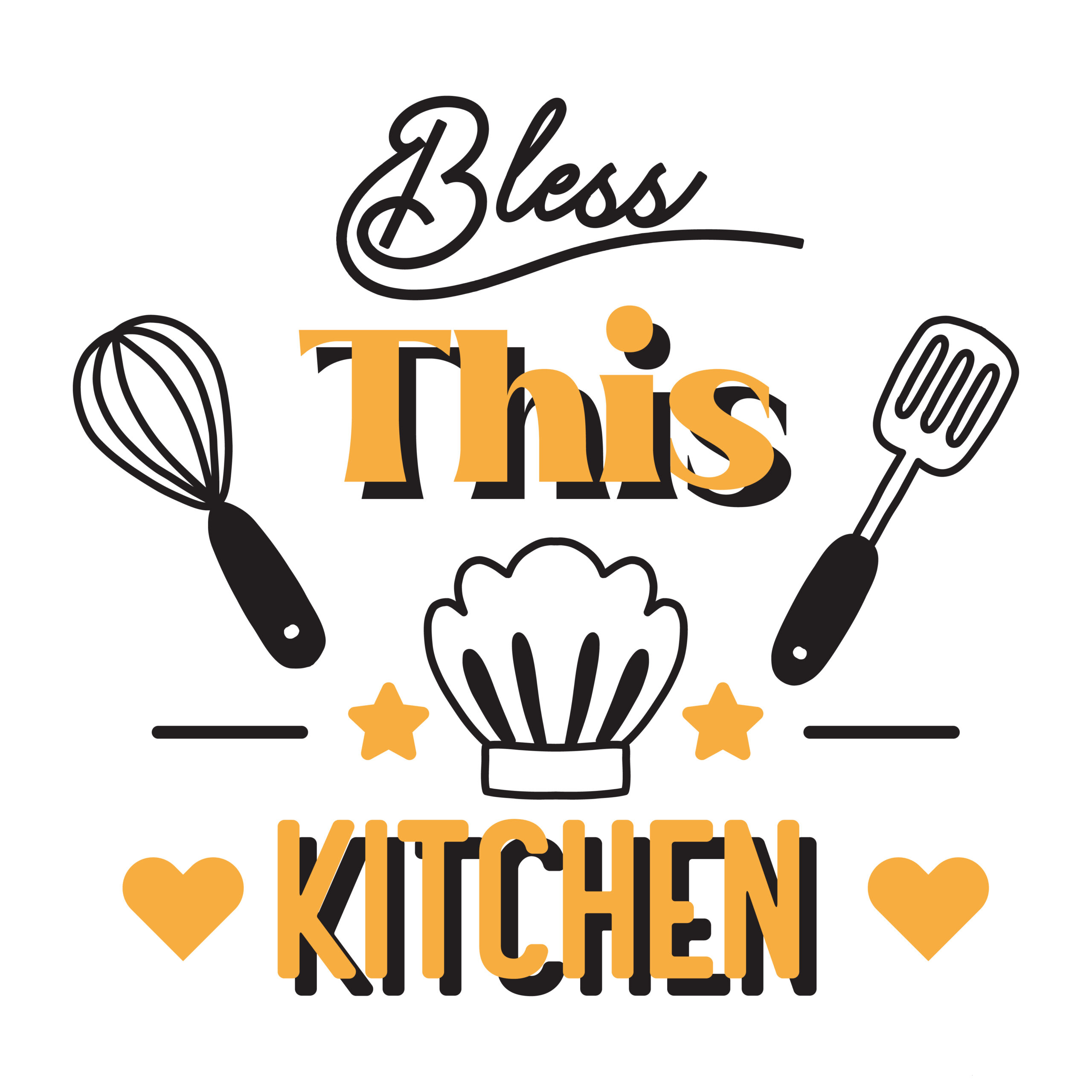 Message “Bless This Kitchen” présenté en typographie lisible, accompagné d’éléments culinaires discrets qui renforcent le thème cuisine.