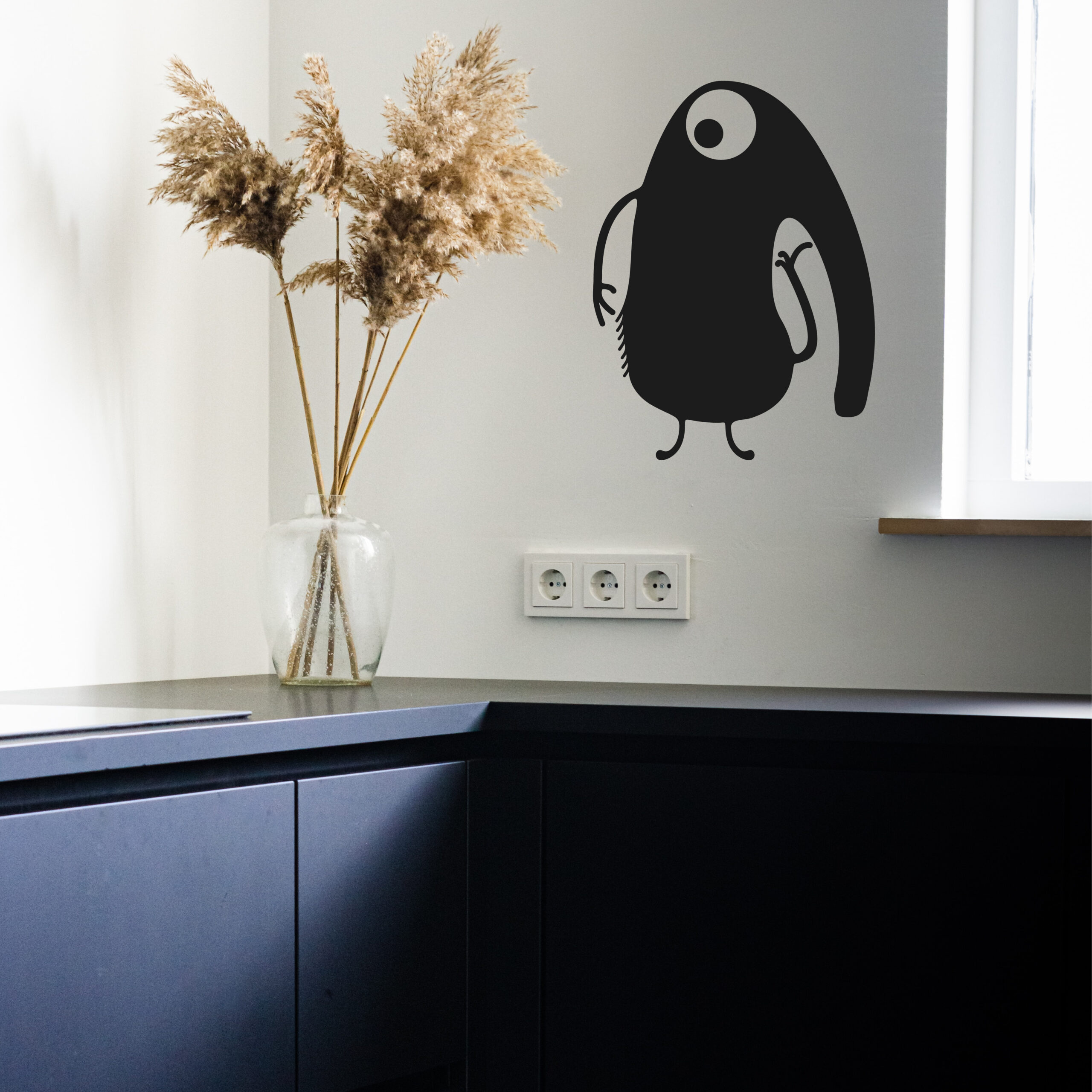 Monstre vert à trois yeux, jambes rayées et bouche inquiétante.