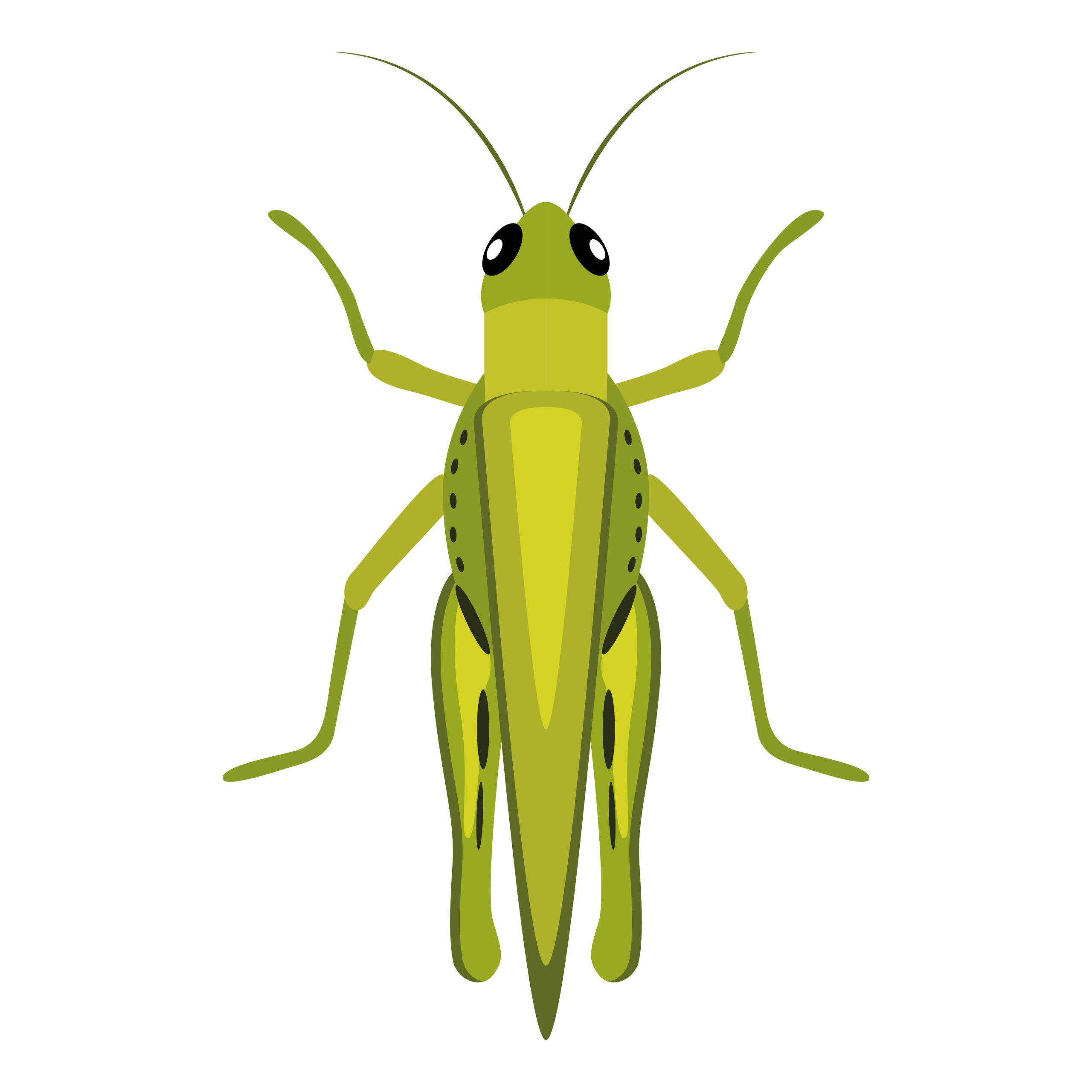 La sauterelle est illustrée avec un corps vert allongé et de longues pattes arrière. Les antennes fines complètent la silhouette.