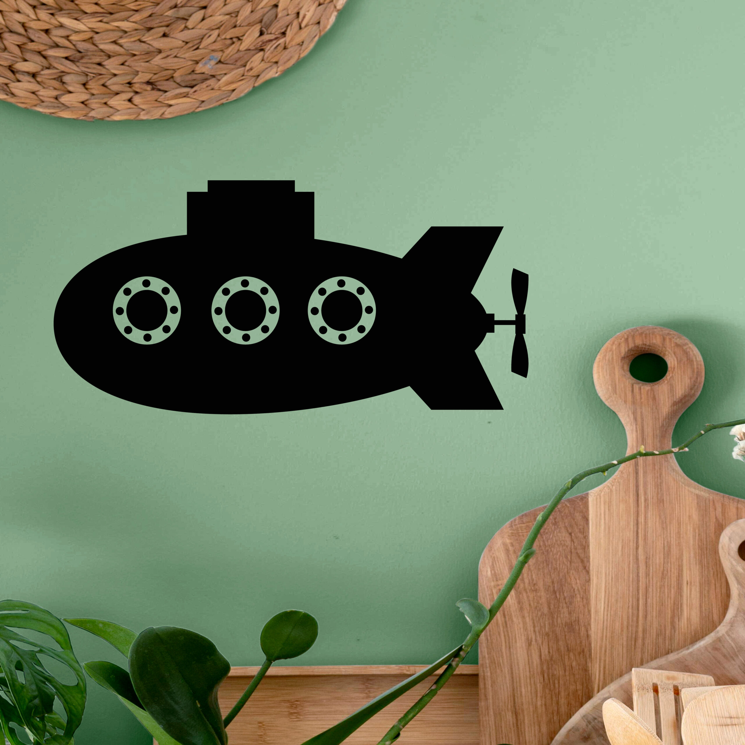 Sous-marin stylisé avec hublots circulaires.
