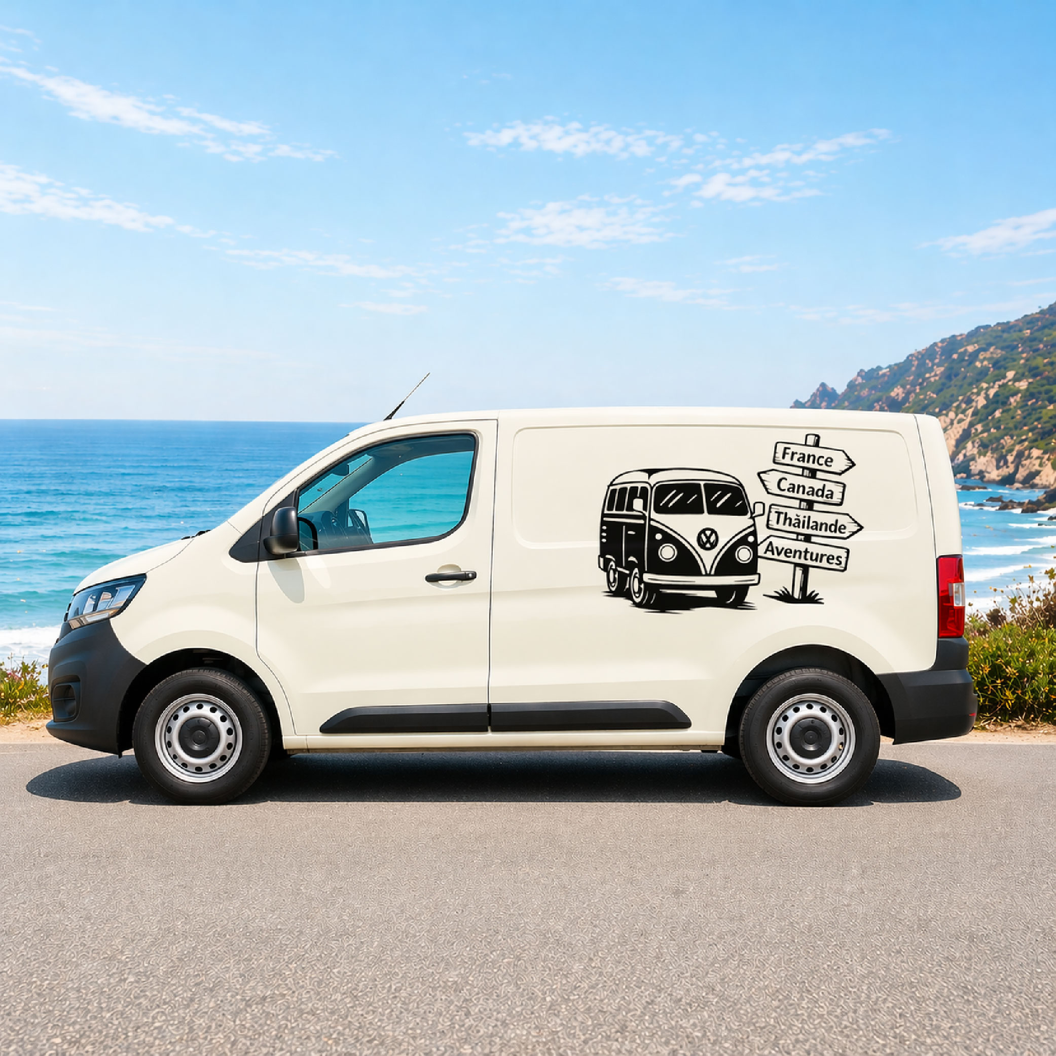 Ces stickers permettent d’apporter une touche visuelle inspirée de l’univers du voyage et de la liberté. Ils s’intègrent naturellement sur un van, un camping-car ou tout autre véhicule, en ajoutant un détail graphique qui évoque l’évasion et la route.
